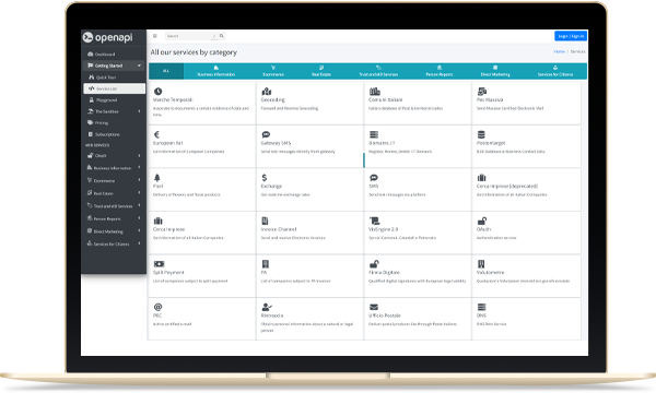Openapi è l'unico provider di API che consente di accedere ai servizi e ai dati ufficiali di Poste Italiane, Camera di Commercio, Agenzia delle Entrate, Pubblico Registro Automobilistico, INAIL, INPS, InfoCert, Aruba e tanti altri tramite la stessa piattaforma ed un unico credito.